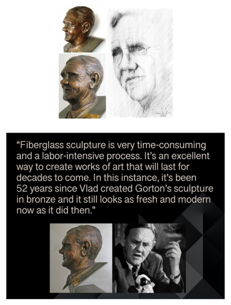 Fiberglass sculpture is very time-consuming and a labor-intensive process. It’s an excellent way to create works of art that will last for decades to come. In this instance, it’s been 52 years since Vlad created Gorton’s sculpture in bronze and it still looks as fresh and modern now then as it did then.