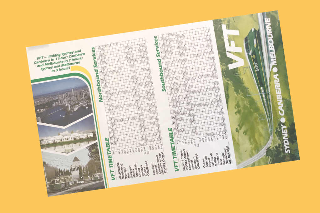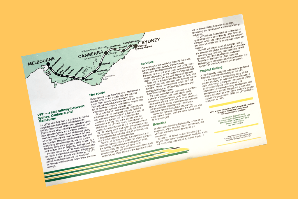 This also involved Vlad Mosmondor, who was the designer on the proposed venture, who produced the branding, style, timetables and publication of the ‘VFT Pre-Feasibility Study Report’. Below are some images of the printed materials of the project. The VFT attracted widespread support from both the general public and sections of government, but the joint venture folded following the failure to secure a favourable taxation agreement with the Federal Government in late 1991.