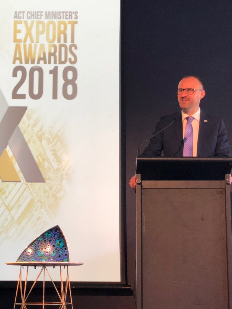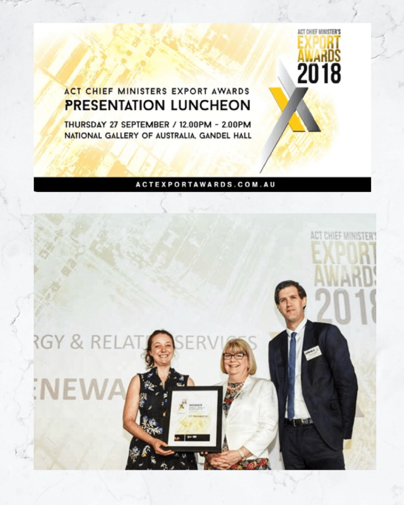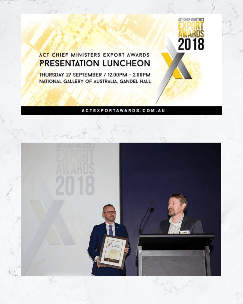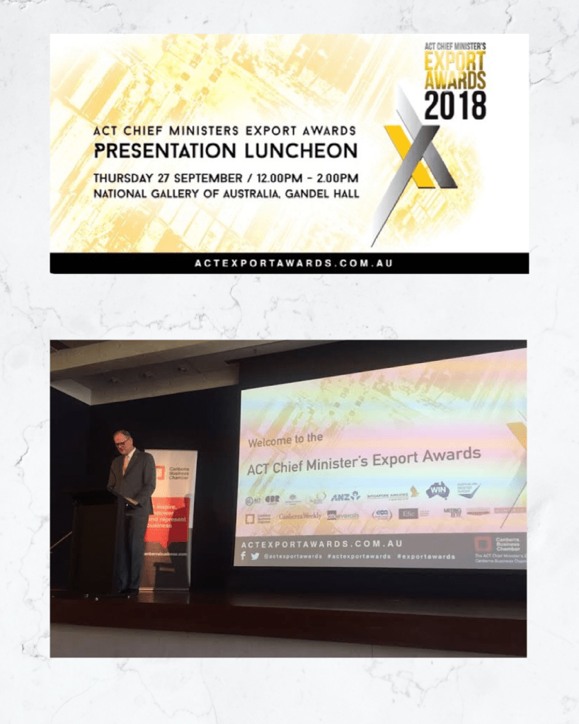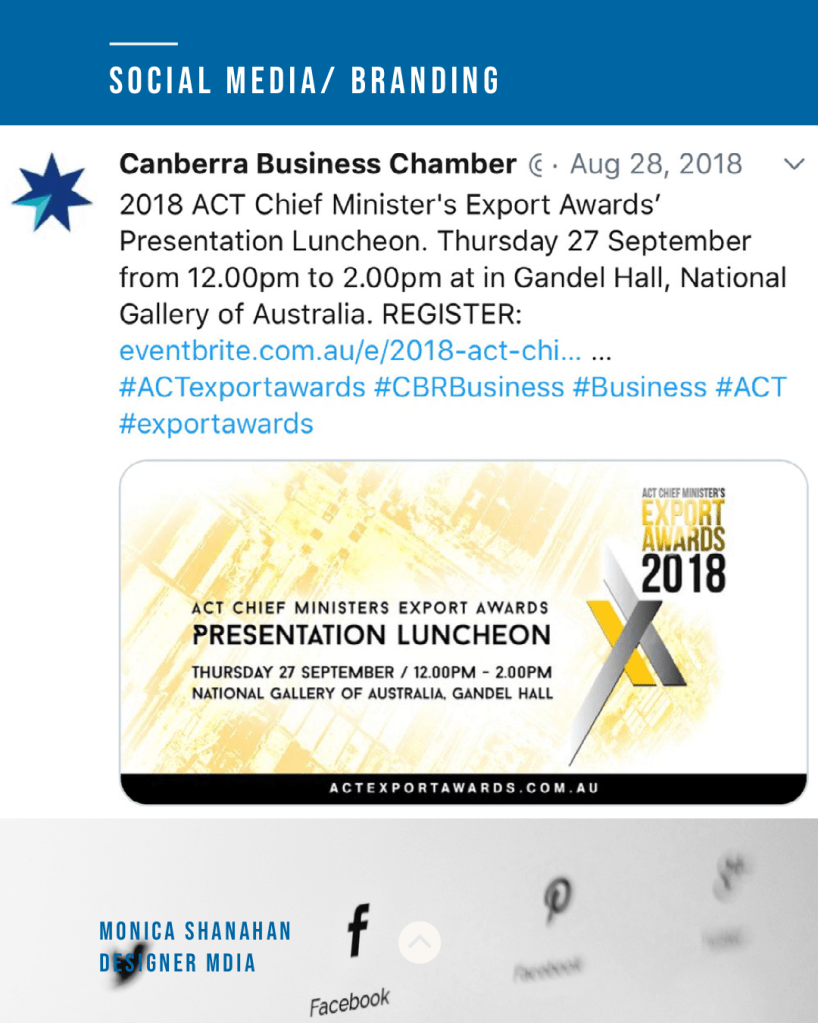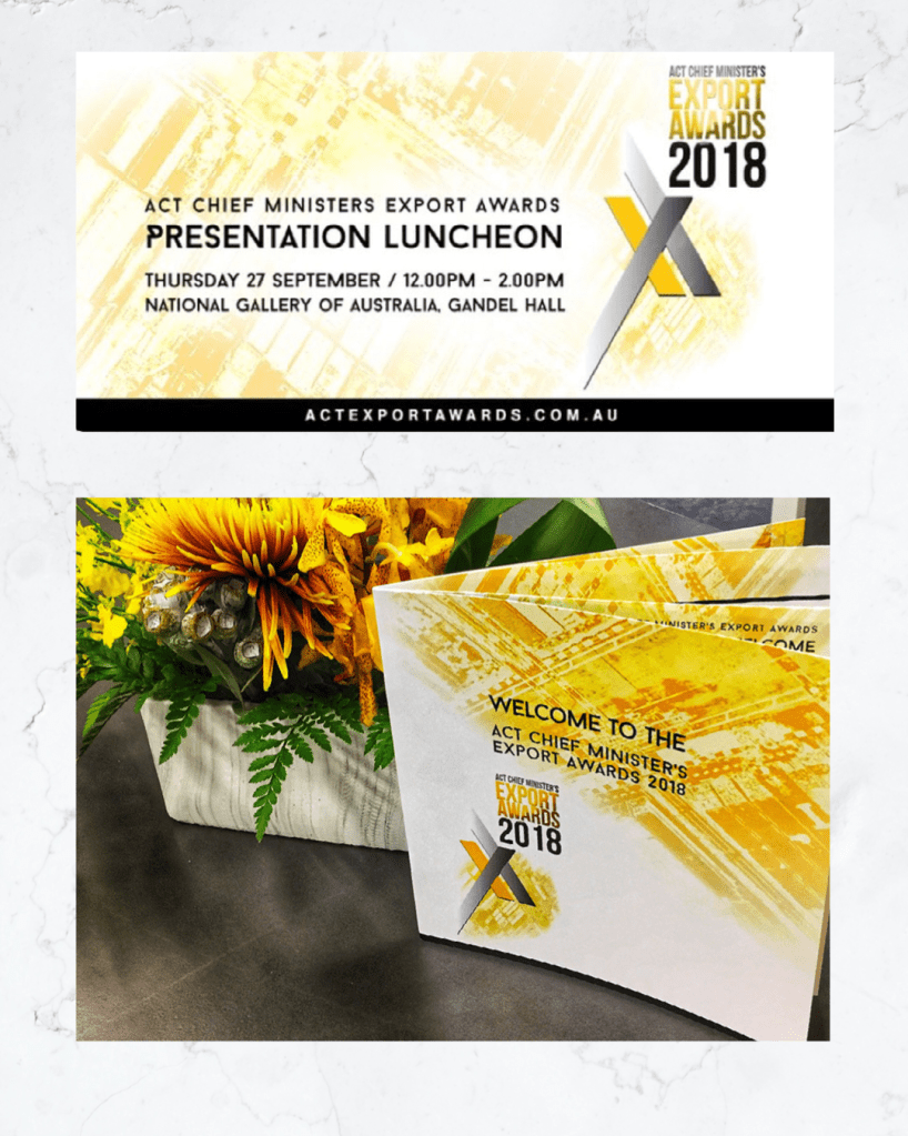 I worked on this project at the Canberra Business Chamber: working on the design, awards, electronic slides, program, and website administrator for the Export Awards. Usually the branding is blue, especially for the logo. In this instance I used a new take on it and made it a gold theme. The décor ie. flowers and colour scheme for the lunch settings complimented the luncheon that was at the National Gallery of Australia in the golden Grand Hall.