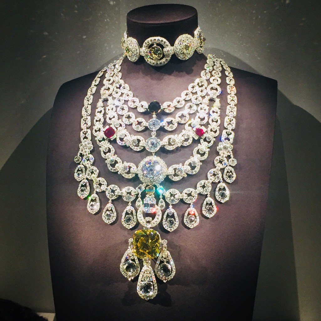 Highlights include Dame Nellie Melba’s diamond stomacher brooch, the Queen’s “Halo” tiara, worn by Kate Middleton at her wedding to Prince William, Duke of Cambridge, Daisy Fellowes’ Tutti-Frutti Hindu necklace, Barbara Hutton’s imperial jadeite necklace, Princess Grace of Monaco’s 10.48-carat diamond engagement ring, Dame Elizabeth Taylor’s diamond and ruby necklace (a gift from her third husband Mike Todd which also doubles as a tiara) and a selection from the NGA’s exceptional Ballets Russes costumes.