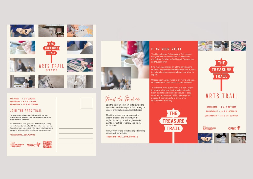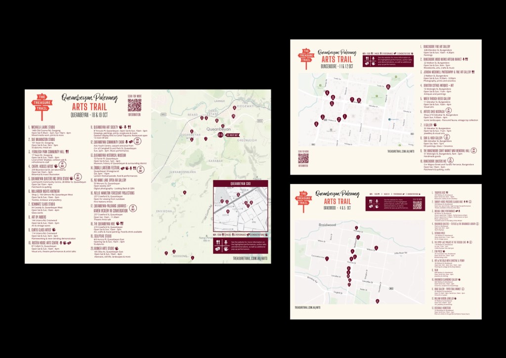 Here are the designs Monica has produced for the regional arts trail that covers Queanbeyan, Braidwood, Bungendore and Captains Flat. (From postcards to posters to digital collateral and marketing material).