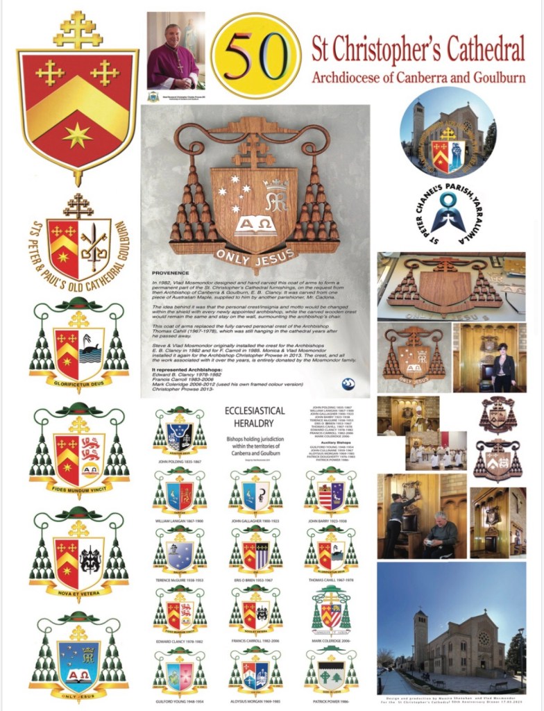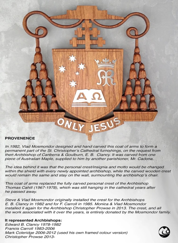 Vlad designed Archbishop’s Carols coat of arms – he was the fifth Roman Catholic Archbishop of Canberra-Goulburn between 1983-2006 (retirement). Carrol was born in Ganmain NSW, second of seven children. Prior to his election as archbishop, Carroll served as Bishop of Wagga Wagga (1968-1983) and was president of the Australian Catholic Bishops Conference (2000-2006). He passed away 14 March 2024, Wagga Wagga aged 93.